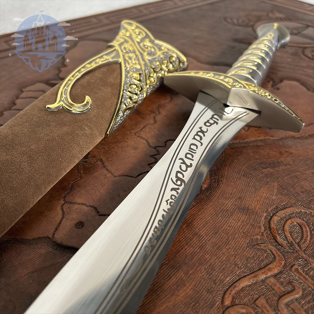Esta réplica ha sido elaborada en acero inoxidable 440, garantizando resistencia y un acabado brillante que refleja la belleza de las armas élficas. La hoja no es afilada, ideal para exhibición segura y coleccionismo.